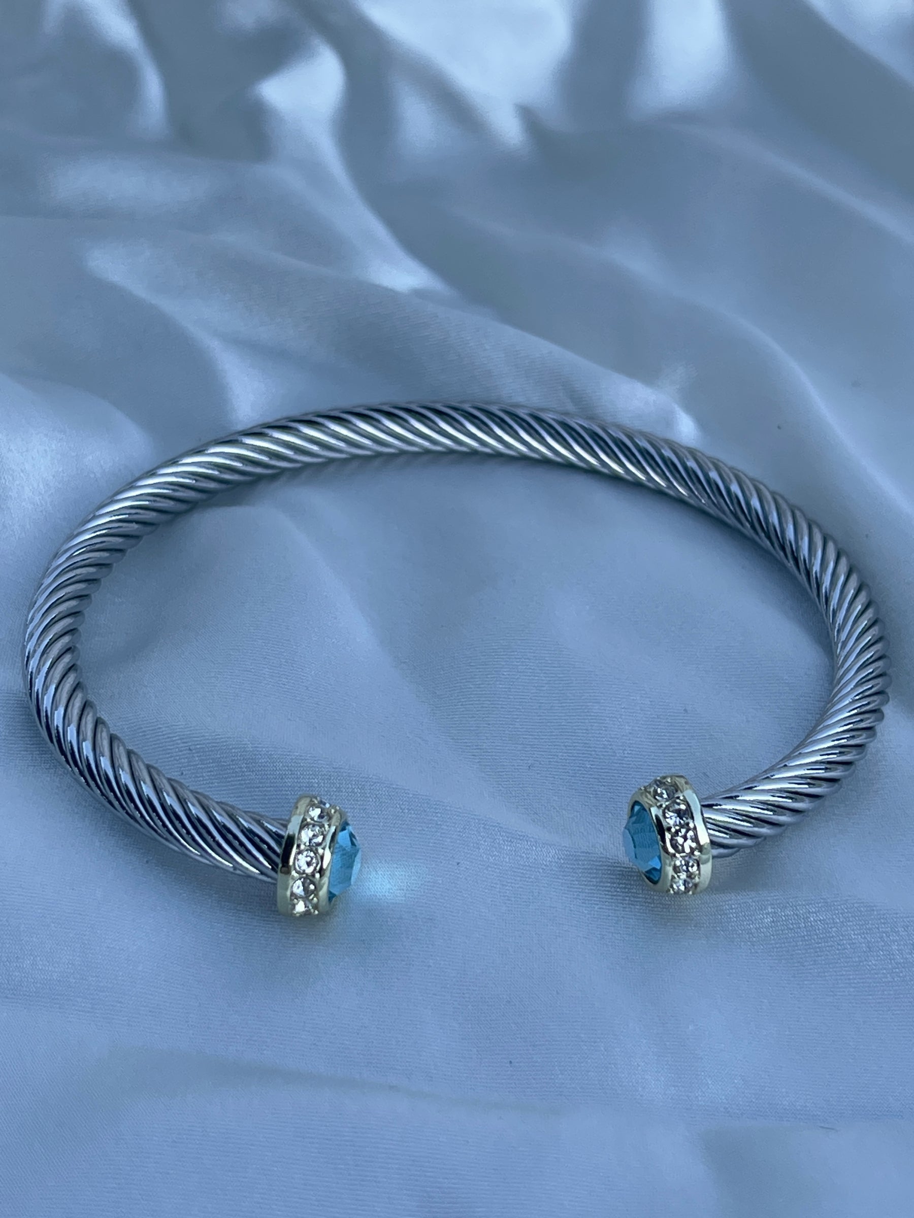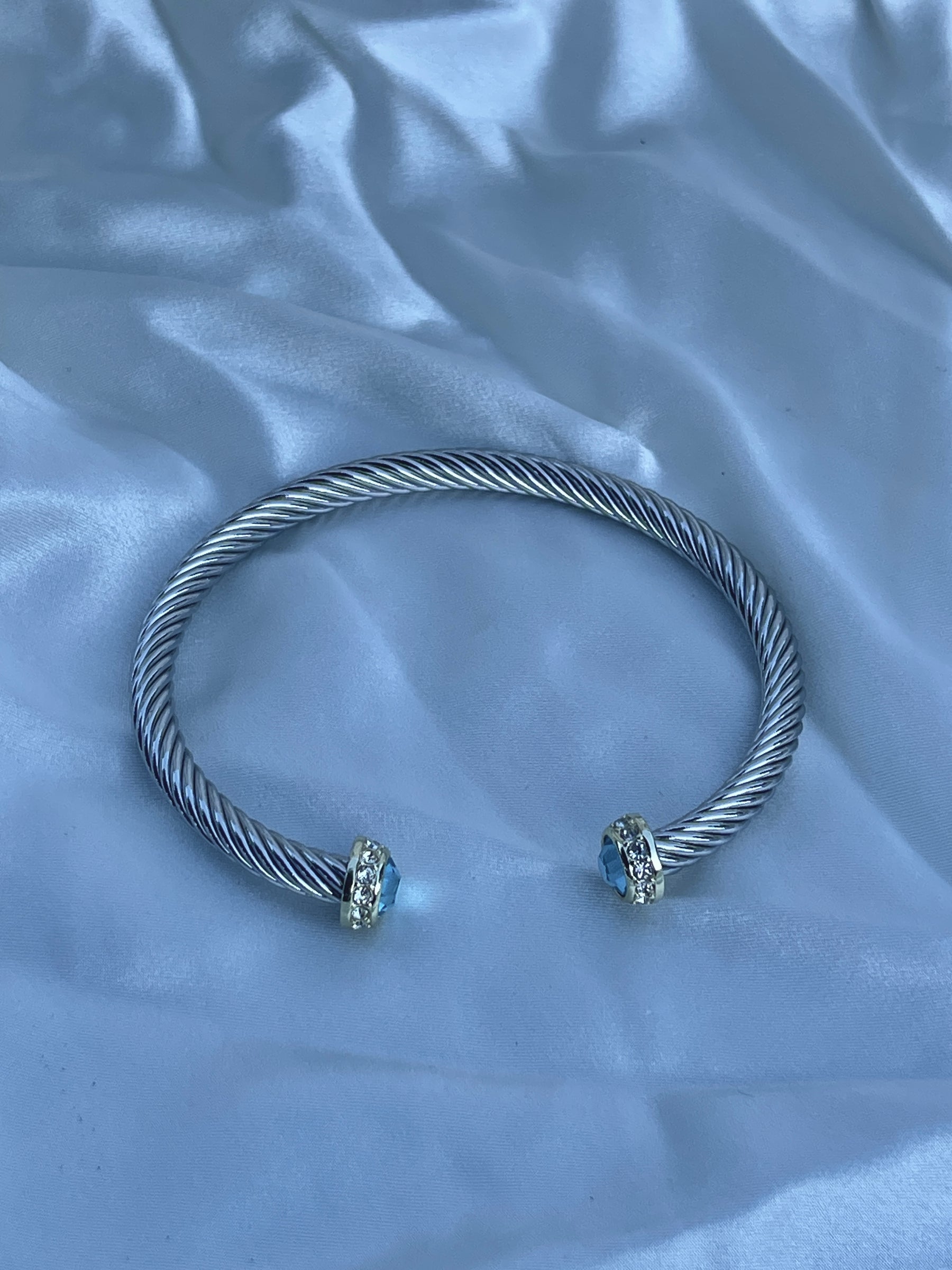 Add a pop of color to your stack with The Capri Blue Cable Cuff—a sleek, twisted silver-tone cable bracelet finished with ocean-blue crystal ends and a halo of clear sparkle accents and made of stainless steel. The open cuff design slips on easily and can be gently adjusted for a comfortable fit. Minimal, polished, and instantly elevating—day to night.