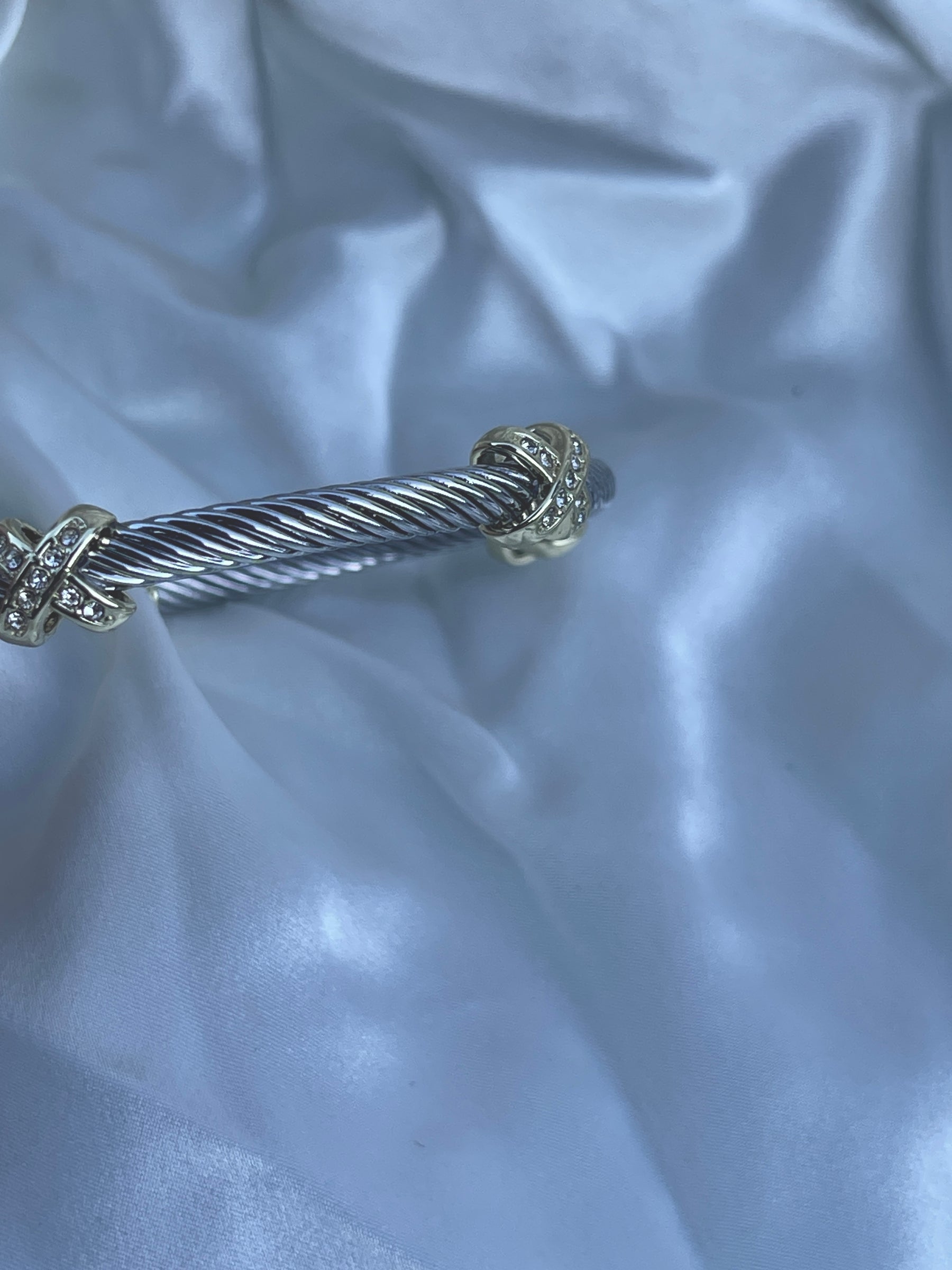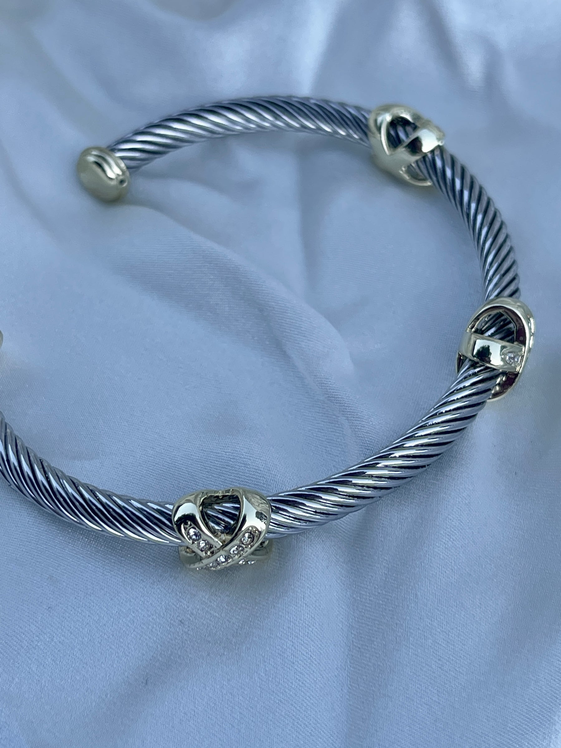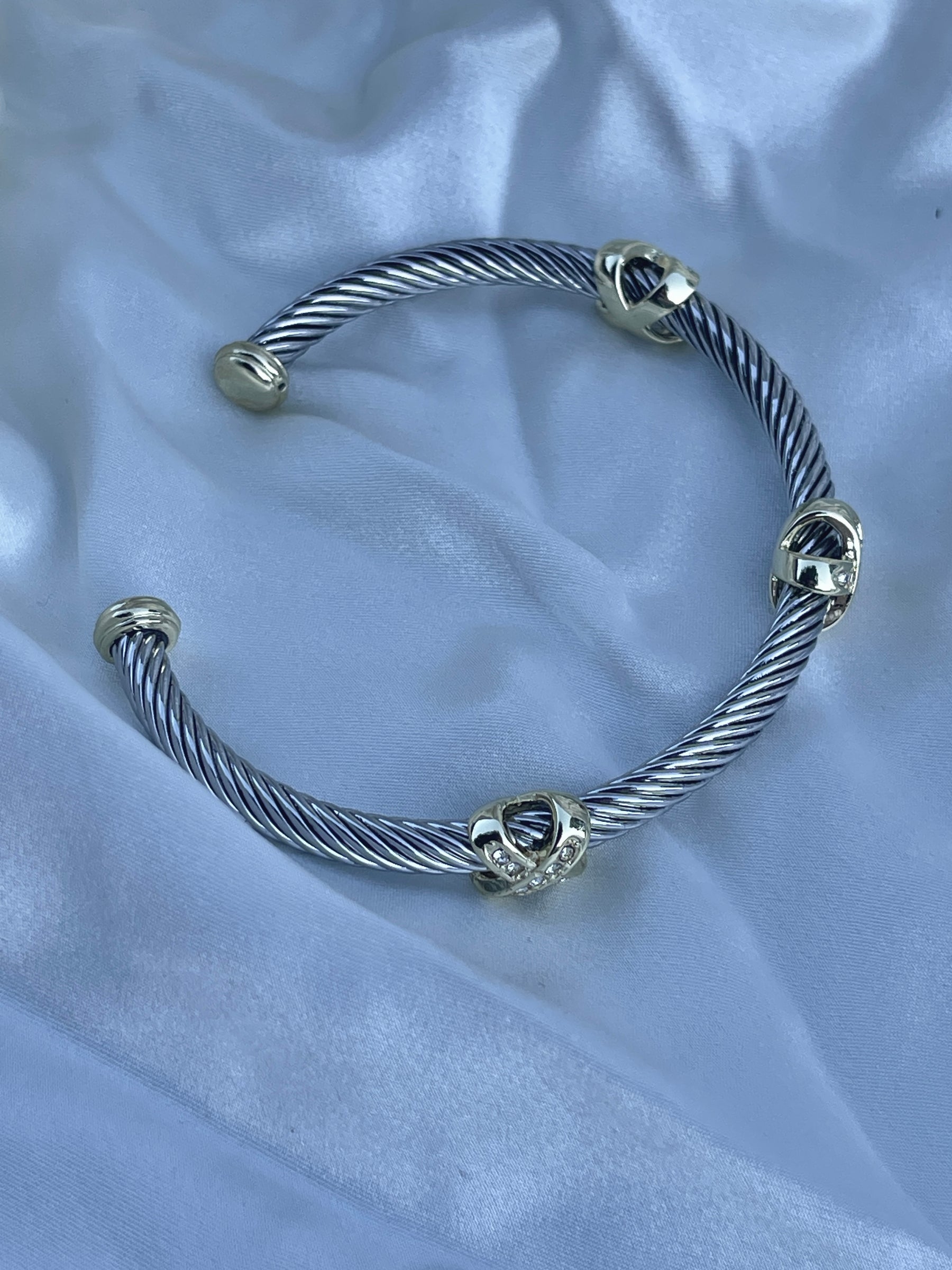 Elevate your everyday stack with this sleek two-tone cable cuff. Featuring a twisted silver-tone stainless steel cable, polished gold-tone end caps, and three decorative stations with sparkling crystal accents, this piece gives that classic “designer-inspired” look—without trying too hard. The open cuff design makes it easy to slip on and gently adjust for a comfortable fit.