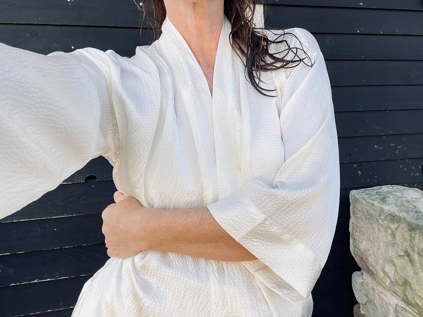 Embrace versatility and timeless elegance with the Bianca hammered silk kimono top in Ivory. This luxuriously textured piece pairs effortlessly tied up with our Imani wrap skirt or as a set with our Estelle pant. Can also be worn alone for a striking, stand alone look with jeans or trousers.
